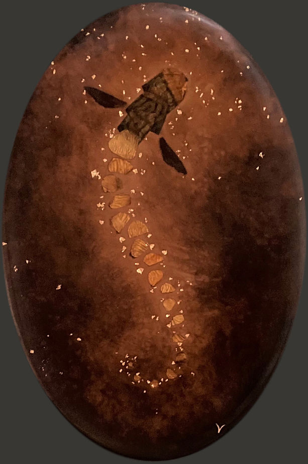 55 x 39 x 1 cm. Smoked mackerel skin, pigments, gold leaf and resin on MDF panel